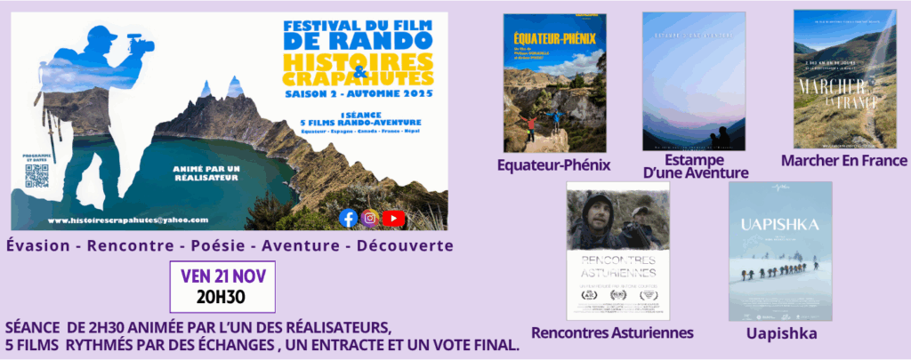 Réservez votre soirée du vendredi 21 novembre ! Nous accueillons le Festival du Film de Rando HISTOIRES & CRAPAHUTES ! 2h30 de projection animées par un réalisateur !